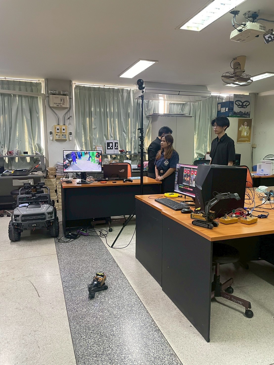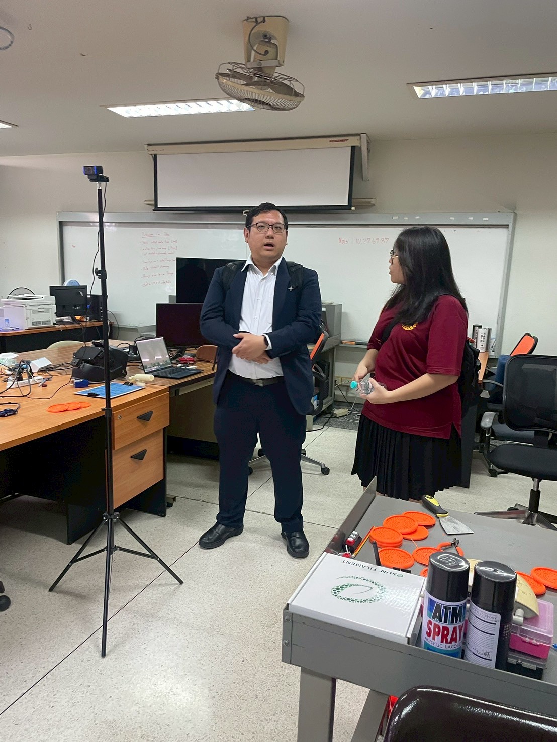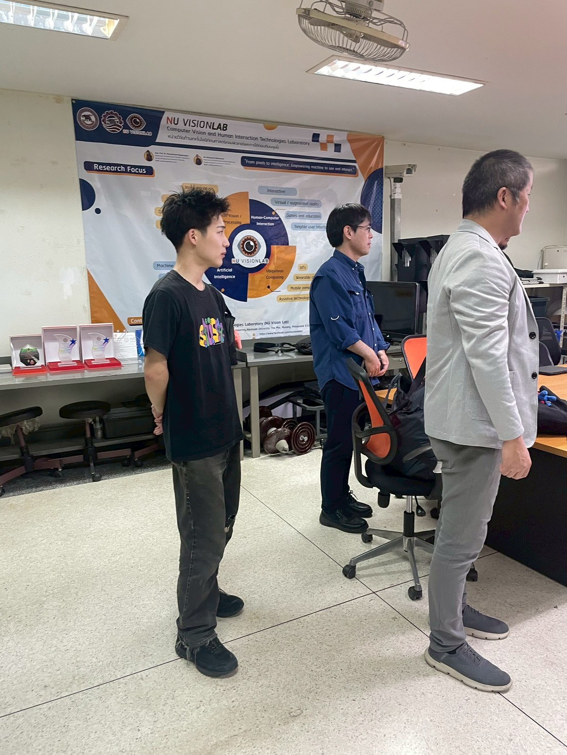 ภายหลังการประชุม คณะผู้บริหารและนักวิจัยได้เข้าเยี่ยมชมห้องปฏิบัติการ Vision Lab ของคณะวิศวกรรมศาสตร์ เพื่อรับชมการสาธิตการควบคุมหุ่นยนต์ที่เชื่อมโยงกับการเคลื่อนไหวของร่างกายมนุษย์ โดยเป็นตัวอย่างของเทคโนโลยีการควบคุมหุ่นยนต์ผ่านการเคลื่อนไหว เช่น การขยับแขน ขา มือ ศีรษะ หรือการเอนตัว ซึ่งการเคลื่อนไหวเหล่านี้จะถูกตรวจจับผ่านอุปกรณ์เซนเซอร์ ระบบกล้อง หรืออุปกรณ์สวมใส่ (wearable devices) ก่อนจะแปลงสัญญาณเป็นคำสั่งเพื่อควบคุมการทำงานของหุ่นยนต์ให้สามารถเคลื่อนไหวหรือปฏิบัติภารกิจได้แบบเรียลไทม์ การสาธิตดังกล่าวสะท้อนให้เห็นถึงศักยภาพของเทคโนโลยีด้านปฏิสัมพันธ์ระหว่างมนุษย์กับหุ่นยนต์ (Human–Robot Interaction) ซึ่งเป็นการผสานการทำงานระหว่างมนุษย์และระบบอัตโนมัติอย่างมีประสิทธิภาพ ช่วยให้การควบคุมหุ่นยนต์มีความเป็นธรรมชาติ แม่นยำ และตอบสนองได้อย่างรวดเร็ว อันเป็นอีกก้าวสำคัญของการพัฒนาเทคโนโลยีและงานวิจัยด้านวิศวกรรมสมัยใหม่ของคณะวิศวกรรมศาสตร์ มหาวิทยาลัยนเรศวร ในการสร้างเครือข่ายความร่วมมือทางวิชาการในระดับนานาชาติอย่างต่อเนื่อง