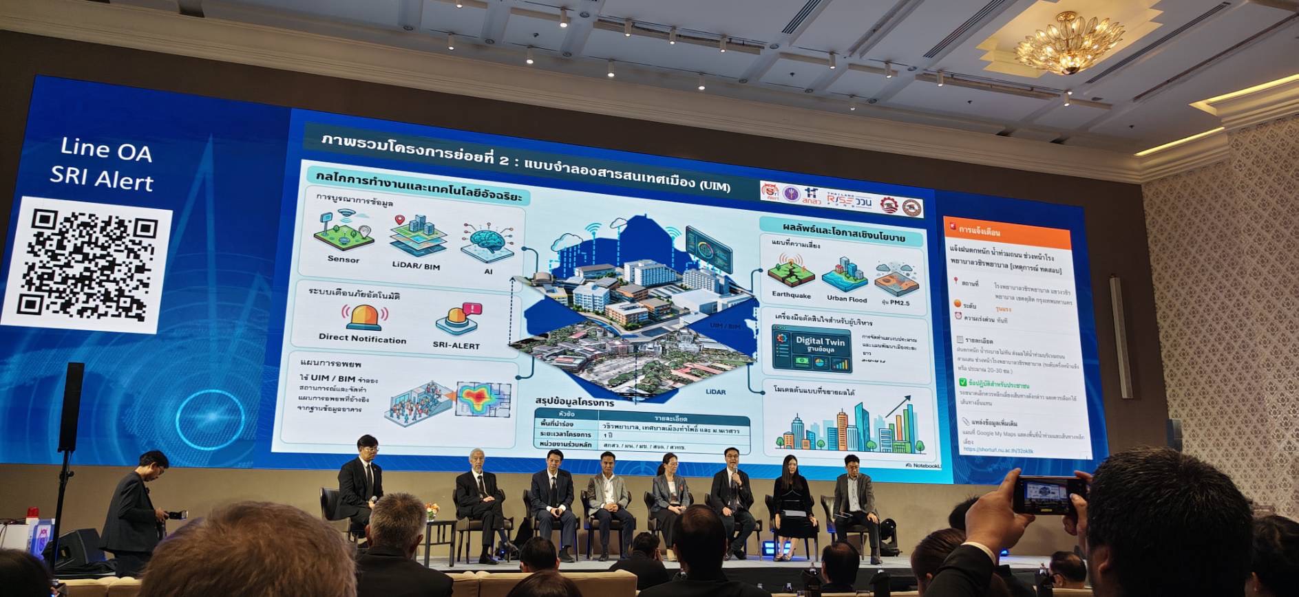 “งานในวันนี้ไม่ได้มุ่งสื่อสารเฉพาะประเด็นแผ่นดินไหวเท่านั้น แต่ยังเป็นเวทีที่ทำให้เห็นว่าประเทศไทยมีงานวิจัยและองค์ความรู้ด้านภัยพิบัติในหลายมิติ ทั้งข้อมูลเชิงพื้นที่ วิศวกรรมโครงสร้าง น้ำ สิ่งแวดล้อม เทคโนโลยีดิจิทัล ระบบคลาวด์ ปัญญาประดิษฐ์ และการมีส่วนร่วมของชุมชน ซึ่งจะถูกนำมาขับเคลื่อนอย่างเป็นรูปธรรมผ่านความร่วมมือของเครือข่ายจากหลายหน่วยงาน นับเป็นจุดเริ่มต้นของการเปลี่ยนผ่านจากการมีองค์ความรู้จำนวนมากไปสู่การมีระบบที่นำองค์ความรู้นั้นไปใช้ได้จริง” ผศ. ดร.เด่นพงษ์ สุดภักดี รองอธิการบดีฝ่ายการศึกษาและดิจิทัล มหาวิทยาลัยขอนแก่น ในฐานะหัวหน้าแผนงาน SRI Alert ระบุว่าแพลตฟอร์มดังกล่าวได้ถูกพัฒนาบนสถาปัตยกรรมที่ทันสมัยและมีความเสถียรสูง รองรับการบริหารจัดการข้อความในปริมาณมาก หนึ่งในจุดเด่นสำคัญ คือระบบ AI ที่ทำงานร่วมกับเจ้าหน้าที่อย่างชาญฉลาด จึงเป็นระบบแจ้งเตือนภัยที่ครอบคลุมและรวดเร็ว ช่วยให้สามารถแจ้งเตือนประชาชนได้อย่างทั่วถึง โดยเป้าหมายหลักคือการสร้างสะพานเชื่อมระหว่างข้อมูลจากภาคสนามกับประชาชนทุกคน ในทุกช่องทางที่พวกเขาใช้อยู่แล้วในชีวิตประจำวัน รวม 5 ช่องทาง คือ LINE Official Account, Telegram , Google Chat, Traffy Fondue และ API Callback ที่รองรับการเชื่อมต่อสำหรับหน่วยงานที่มีระบบของตนเอง